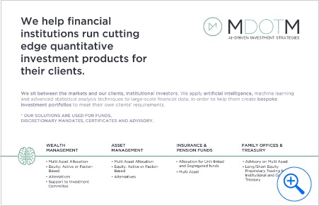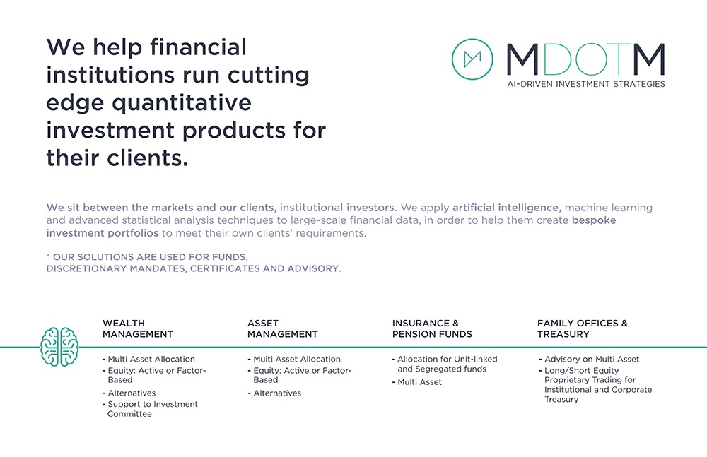 MDOTM's mission is to radically change the approach to investing by exploiting AI, machine learning and advanced statistical methods. The company works with financial institutions (Banks, Asset Managers, Wealth Managers and Insurances) to help them create cutting edge quantitative investment strategies with a strong scientific and data driven methodology. MDOTM develops bespoke investment portfolios that meet the clients specific requirements. Once defined the client's profile (risk, return ratios, etc.), the AI is used to analyse financial markets and periodically create ideal portfolios for them to execute against, for their new or existing mandates, funds, discretionary mandates.