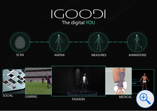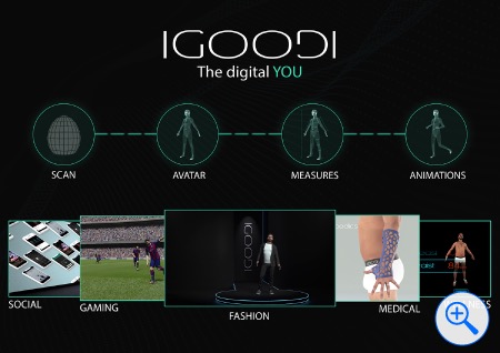 The IGOODI system includes: a 4D full body scanning booth; a technology platform; and a mobile application, available for iOS and Android, for managing one's avatar.